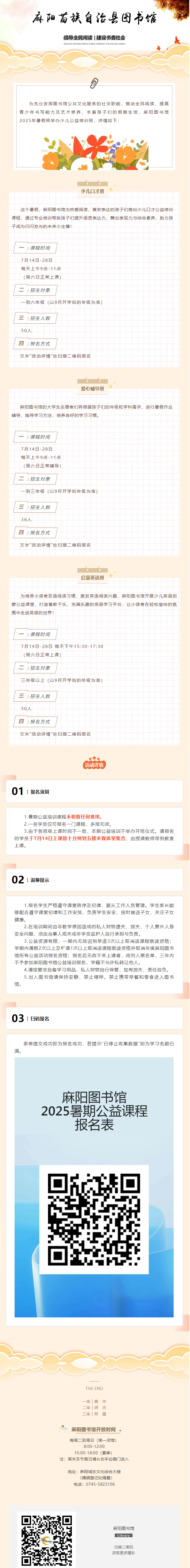 少兒口才、啟蒙英語、愛心輔導,暑期公益課程開始報名! 麻陽苗族自治縣人民政府 https://www.zwgsc.com 發布時間: 2025-07-09 09:58 【字體:大 小】 分享到 來源:麻陽圖書館 作者: