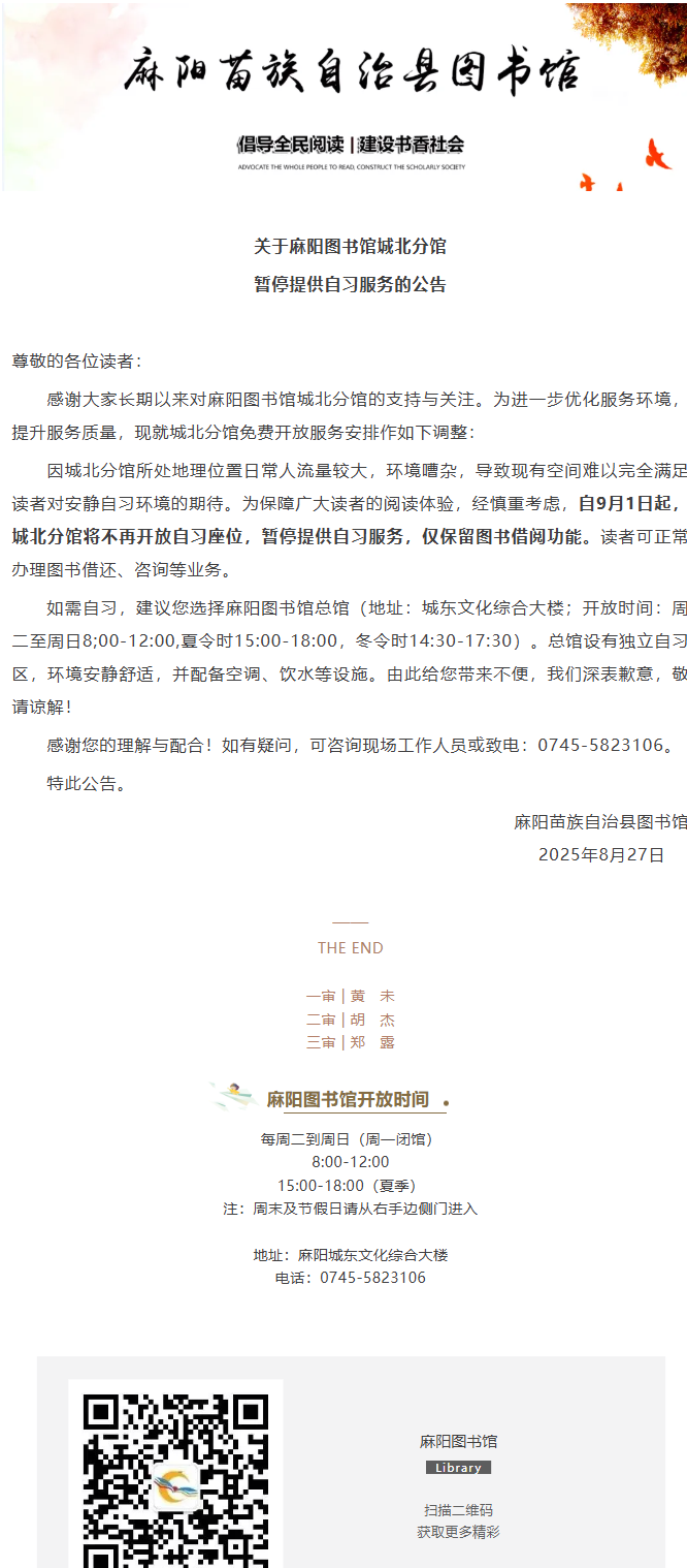 關於麻陽圖書館城北分館暫停提供自習服務的公告