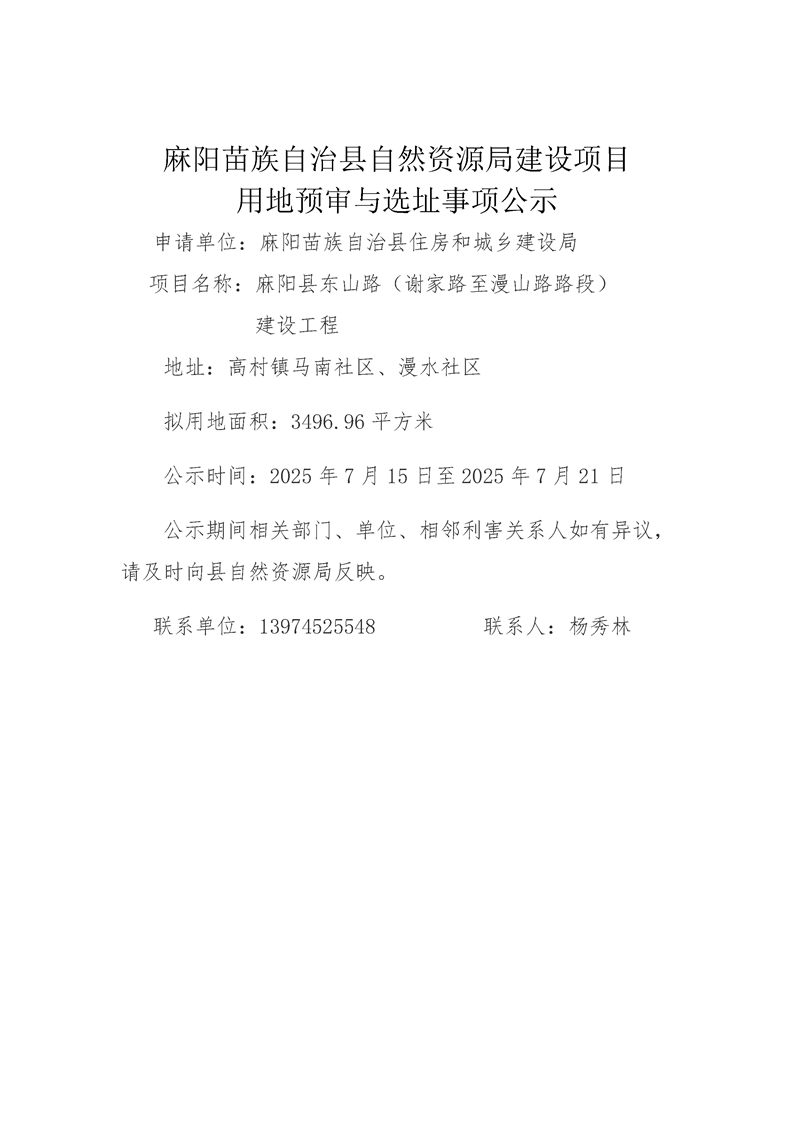 建設項目用地預審與選址事項公示(麻陽縣東山路(謝家路至漫山路路段)建設工程) 麻陽苗族自治縣人民政府 https://www.zwgsc.com 發布時間: 2025-07-15 08:36 【字體:大 小】 分享到 來源:麻陽縣自然資源局 作者: