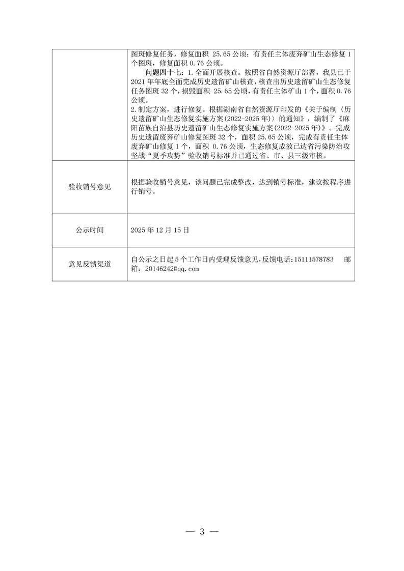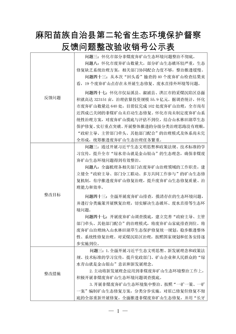麻陽縣第二輪省生態環境保護督察反饋問題整改驗收銷號公示表