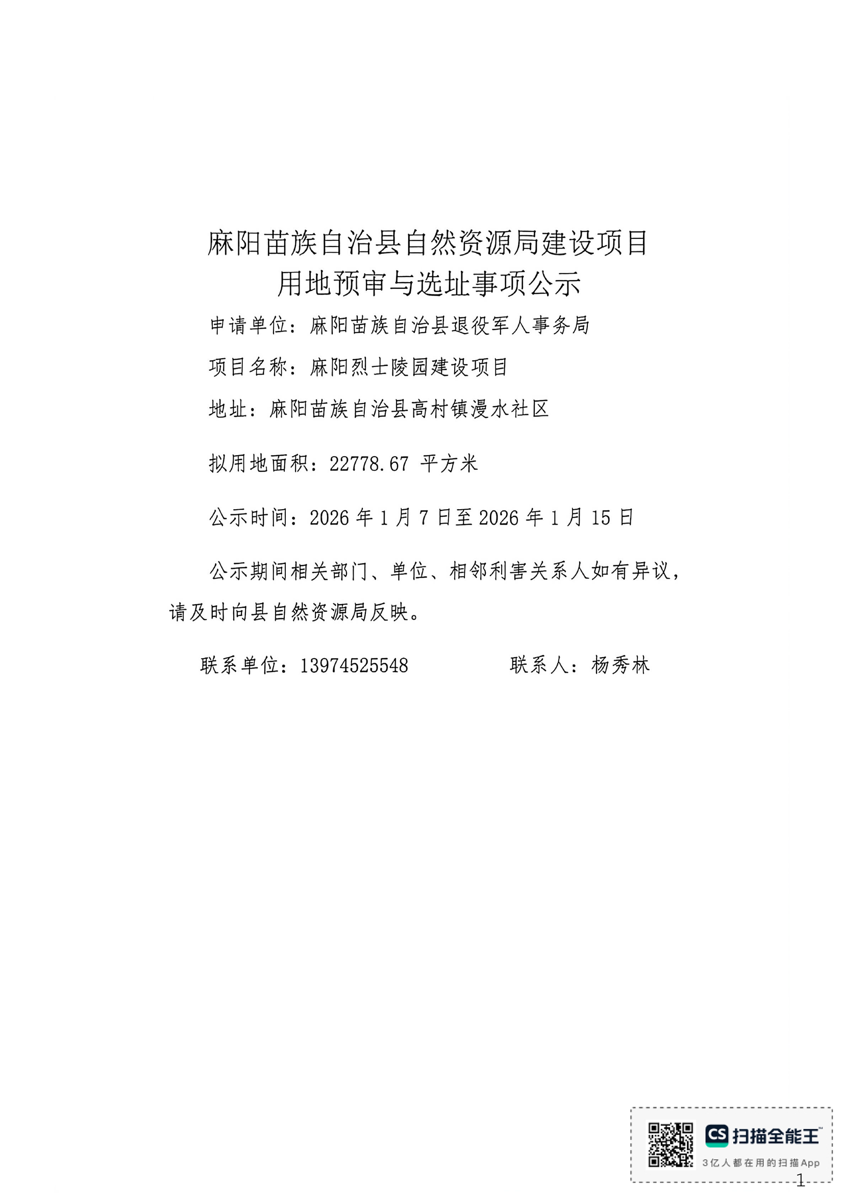 建設項目用地預審與選址事項公示(麻陽烈士陵園)