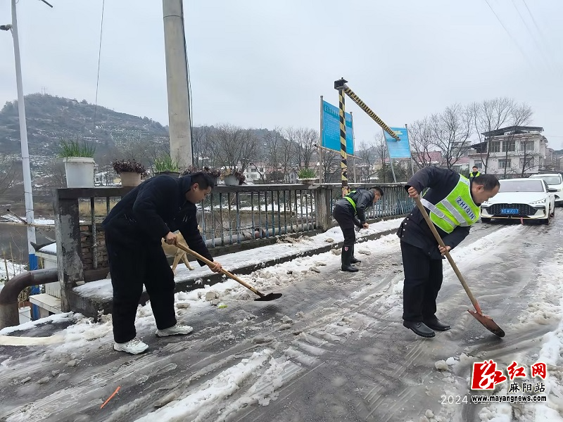除雪現場,幹部職工帶著鏟子、掃把在滕代遠大橋、平原村橋頭、黃雙衝村口等清理道路上的冰雪。盡管天氣寒冷,清雪工作也一直沒有停歇,你一鏟我一鏟,一點點將轄區及周邊路麵積雪和冰層鏟起並集中堆放,為往來車輛、人員開辟出一條安全暖心的出行路。