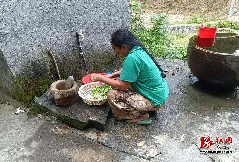 大灣村灣裏院子村民正在用新接的山泉水洗菜做飯