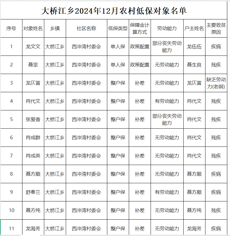 【社會救助】大橋江鄉2024年12月農村低保對象名單