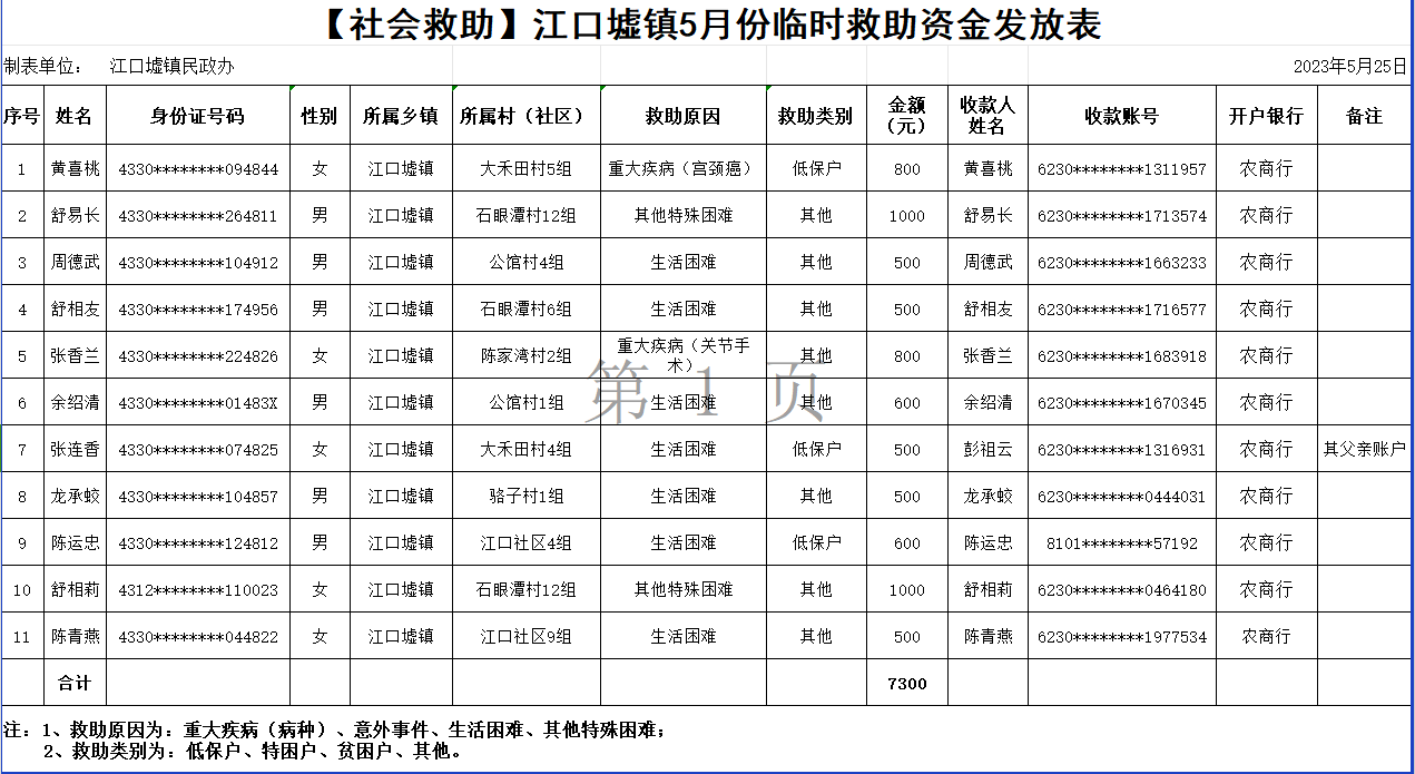 【社會救助】江口墟鎮5月份臨時救助資金發放表