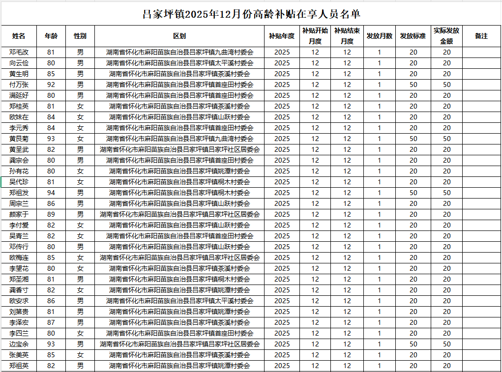 【社會救助】呂家坪鎮2025年12月份高齡補貼在享人員名單 麻陽苗族自治縣人民政府 發布時間: 2025-12-31 11:22 【字體:大 小】 備注:正文隻展示部分信息,完整信息請下載附件瀏覽 附件:【社會救助】呂家坪鎮2025年12月份高齡補貼在享人員名單 分享到 來源:麻陽縣呂家坪鎮 作者: