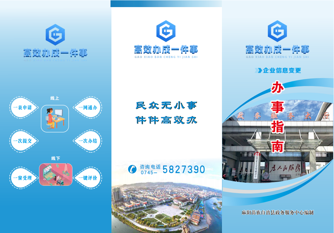 麻陽縣“高效辦成一件事“辦事指南——企業信息變更 麻陽苗族自治縣人民政府 https://www.zwgsc.com 發布時間: 2025-09-26 10:17 【字體:大 小】 分享到 來源:麻陽縣政務服務中心 作者: