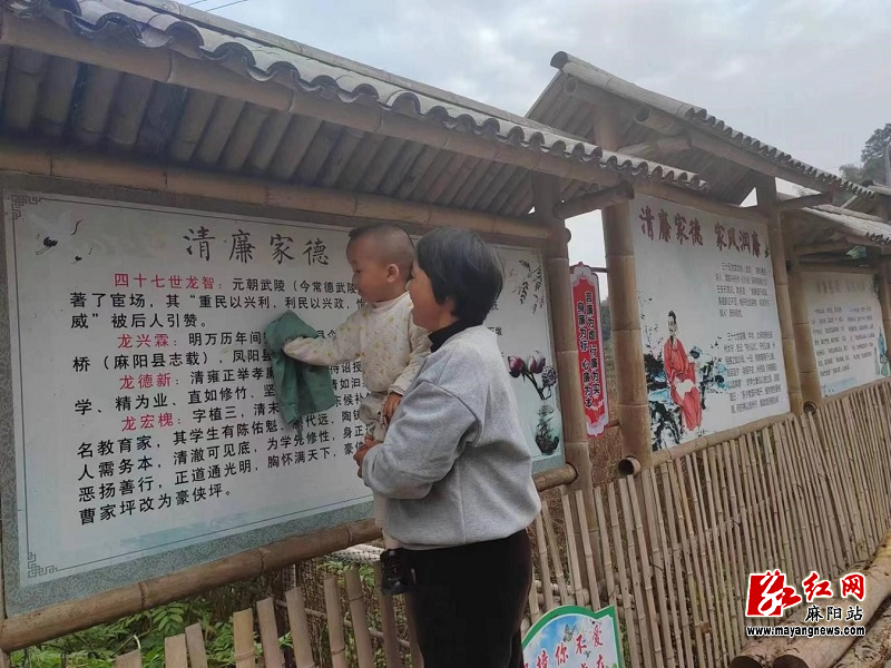 “孝順,即孝敬順應父母,長輩的良好期望意願,敬重回報父母長者的恩澤……”近日,在麻陽大橋江鄉豪俠坪村清廉文化陣地,稚嫩清脆的朗讀聲回響,該村婦聯主席正帶著村內的少年兒童學習“忠孝”文化牆板塊的內容。
